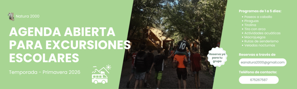En Natura 2000 ofrecemos acampadas escolares diseñadas para vivir una experiencia única al aire libre. Dirigidas a colegios, institutos y grupos juveniles, nuestras actividades se desarrollan en primavera y otoño, combinando aventura, educación ambiental y convivencia. Elige entre diferentes modalidades ¡y adapta la experiencia a las necesidades de tu grupo!